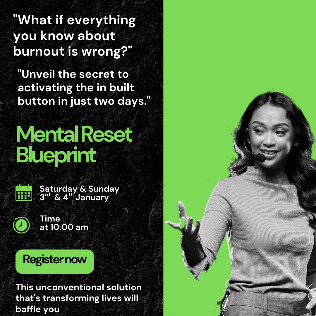 Itβs Called The 2-Day Mental Reset Blueprint Workshop . And Inside I'll Help Unblock your deep rooted concerns using My MB blueprint That will help you transform 180 degree and help you excel in all fields of your life.